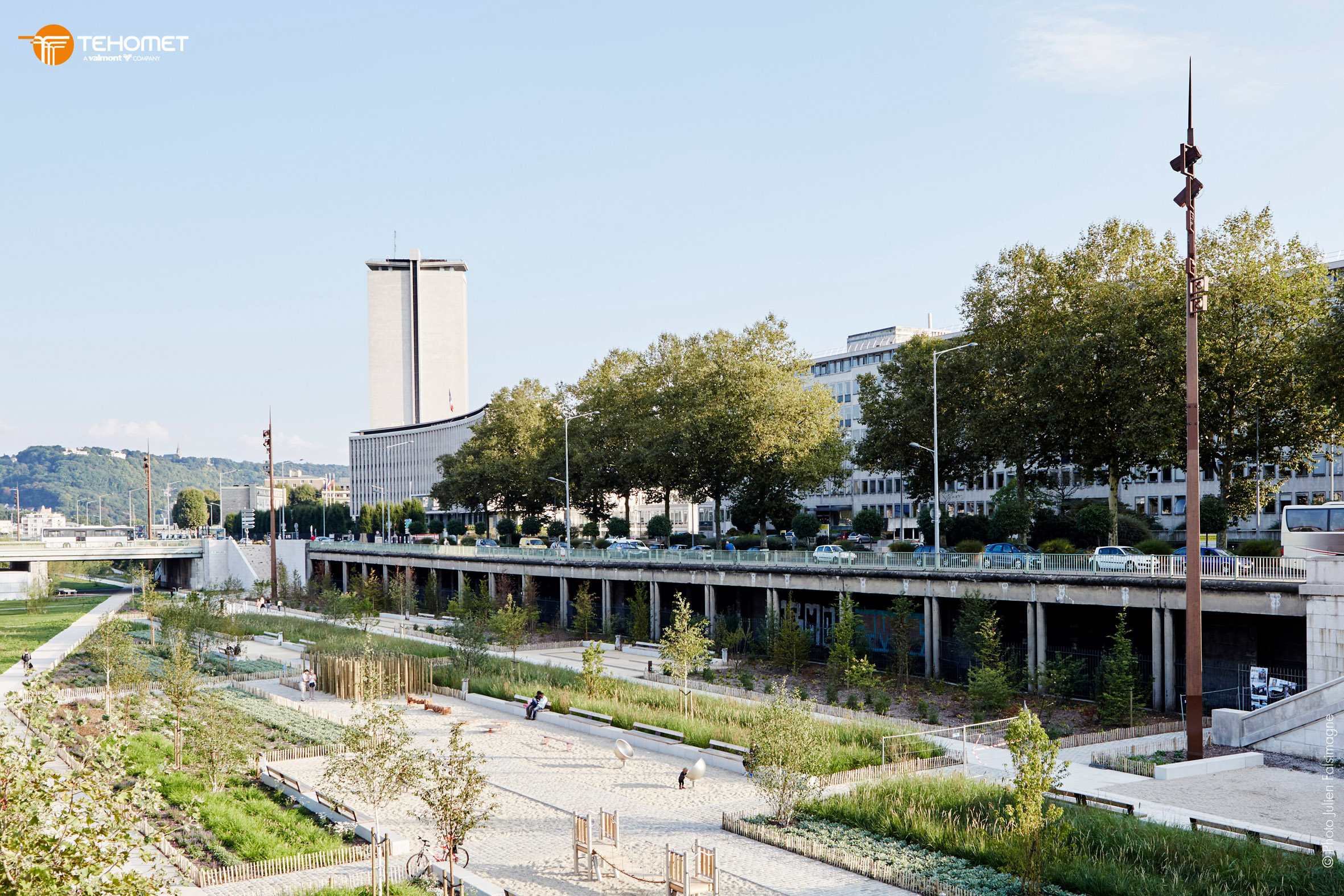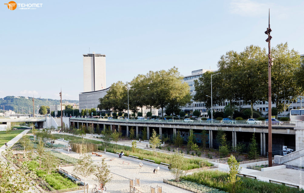 Reconversion des quais bas rive gauche de la seine à Rouen et de la presqu’île Waddington. Séquencés en trois parties, les quais bas accueillent un parc paysager, des jardins en